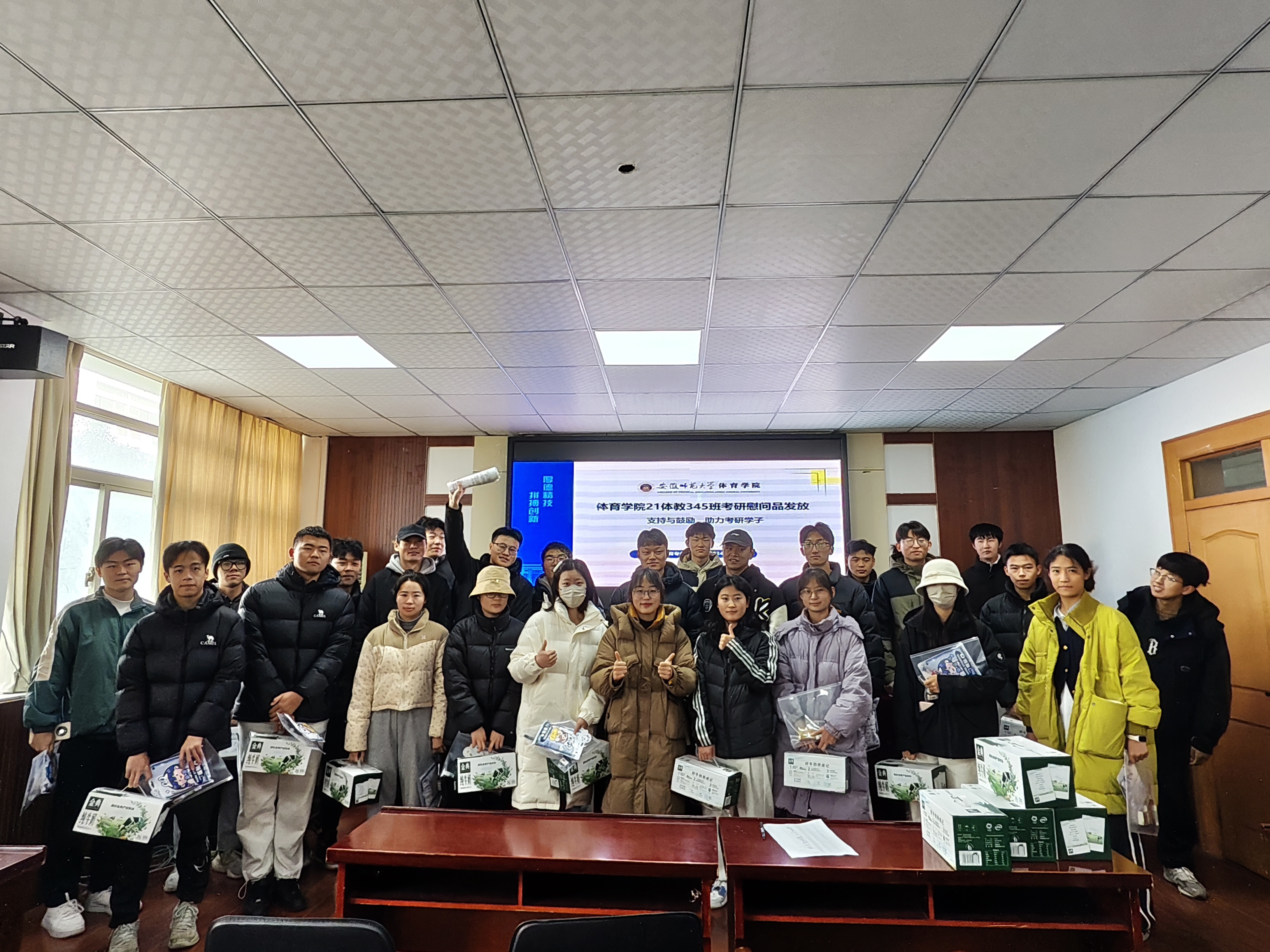 会后,毕业班辅导员为考研学子发放牛奶、文具和暖冬物资,为考研学子护航。
