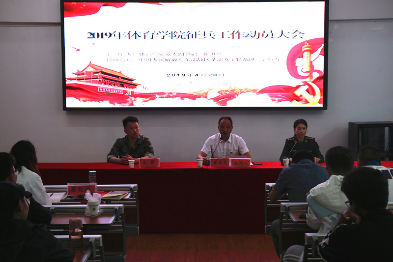 本网讯(437ccm必赢国际版 孙昊 张义曜)4月20日下午,437ccm必赢国际版召开2019年征兵工作动员大会,全体专兼职辅导员、各年级各专业有志携笔从戎的120名体院学子参加了动员会。大会特邀专程来芜参加芜湖市高校征兵动员会的中国人民解放军东部战区某部女子特战队排长、曾就读于我校的437ccm必赢国际版2011级运动训练专业学生佘小雪担任主讲人,芜湖市军分区参谋朱蕾同志应邀参会,437ccm必赢国际版党委副书记崔世兵出席并主持会议。