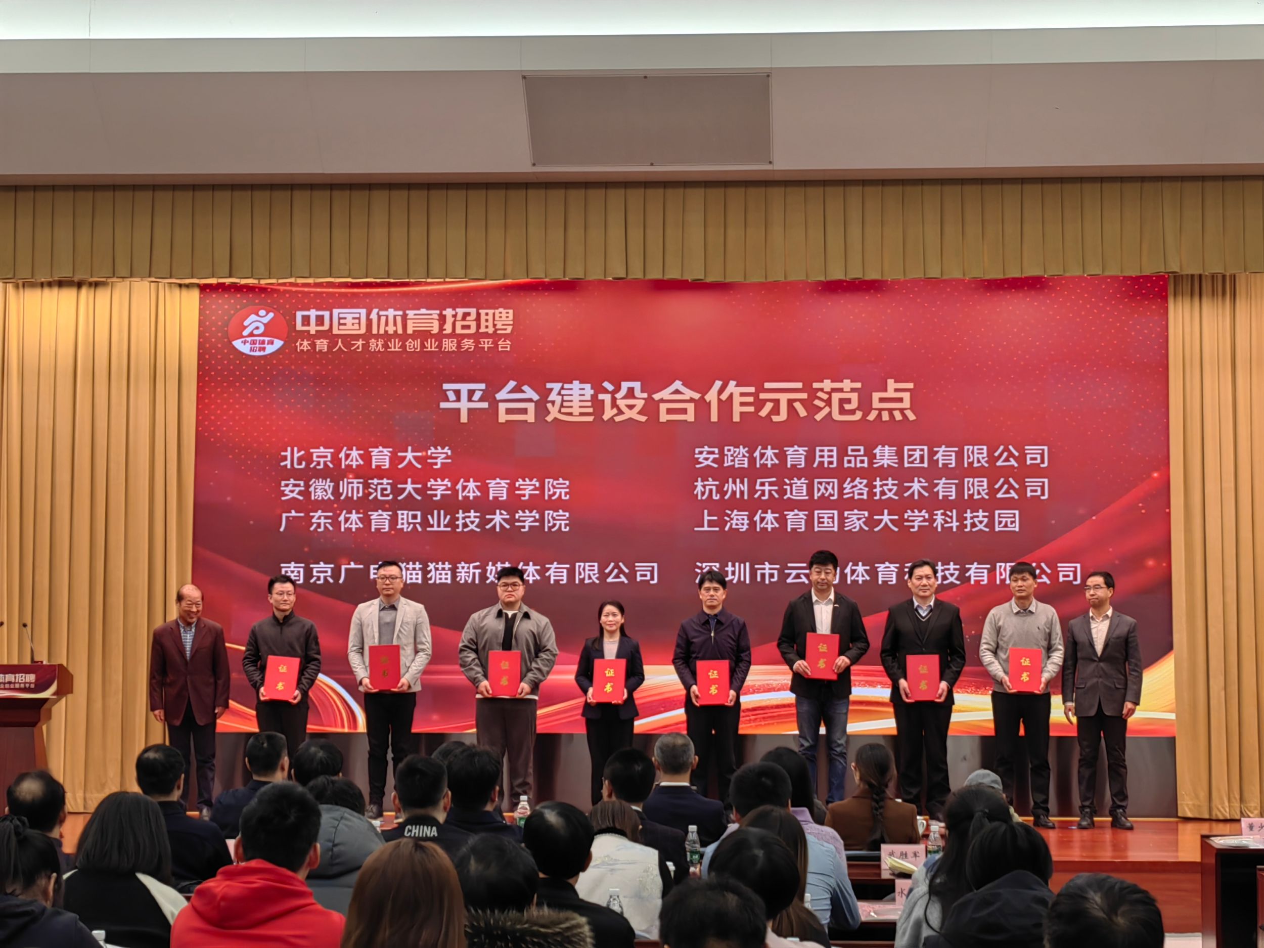 发布会上,体育总局人事司向北京、吉林、上海、江苏、山东、河南、重庆、宁夏等8个省(区、市)体育局颁发了平台建设试点单位证书;体育基金管理中心、中华全国体育基金会向北京体育大学、437ccm必赢国际版等3所体育院校、安踏体育用品集团有限公司等3家优秀企业颁发了平台合作示范点证书;体育总局举重摔跤柔道运动管理中心、中国高尔夫球协会、全国普通高校毕业生体育服务行业就业创业指导委员会分别与体育基金管理中心签署了平台建设合作协议,共同推动“中国体育招聘”平台高质量建设。