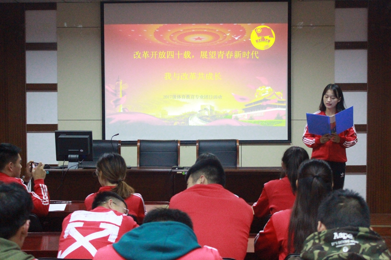 10月13日晚7点,2017级社会体育指导与管理专业全体团员于437ccm必赢国际版二楼会议室召开“我与改革共成长”主题团日活动。活动开始,由17社体团支部书记刘勇同学上台致开场词并介绍本次团日活动。随后,在刘勇同学的主持下观看《厉害了,我的国》纪录片,1978-2018,坚持改革开放,不断加大改革开放的深度、广度,中国正逐渐强起来。四十年艰苦奋斗,17社体的同学们吃水不忘挖井人。全体团员的为改革开放四十年录制视频,为伟大的祖国送上祝福。在行动上积极主动的向学习团的知识,努力向党组织进行靠拢,在思想上坚持中国共产党的领导,紧跟党的步伐,做一个合格的共青团员。举办“我与改革共成长”团日活动的还有2017级体育教育专业以及2017级运动训练专业、2017级休闲体育专业团支部。他们以自己的形式去追寻改革开放,学团史、树团情,在历史中回味改革开放的时代意义。