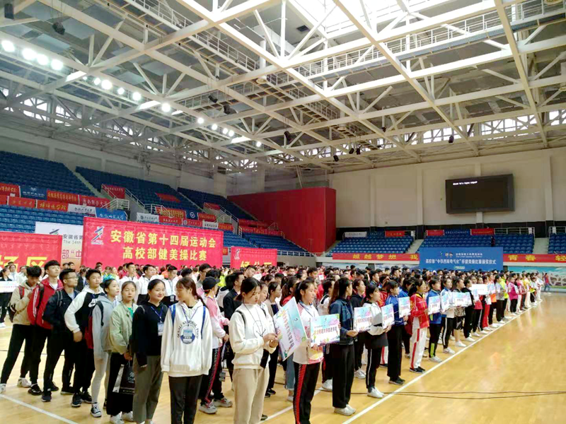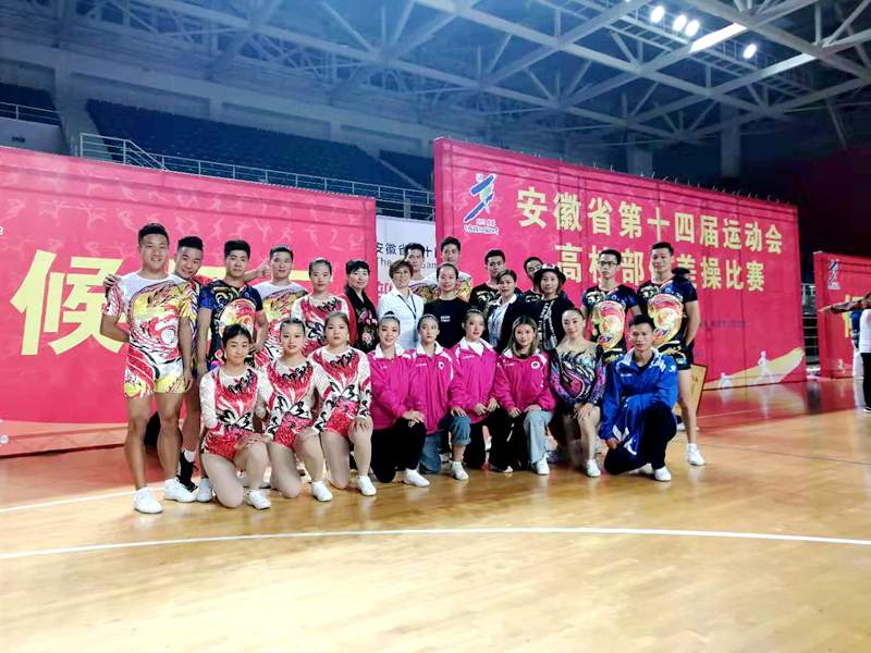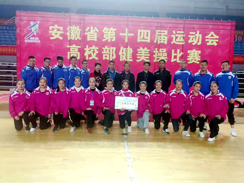 本网讯(437ccm必赢国际版 孙明月)2018年10月20日-26日,安徽省第十四届运动会高校部健美操比赛在安徽蚌埠龙湖体育馆举行。全省共有40余所高校600余名运动员参加了这项赛事,我校由437ccm必赢国际版院长席玉宝教授带队,派出了金迪、程燕、蔡璐璐、郝利玲为主的教练员团队,陈自强、孙明月等24名学生组成的运动员队伍,参加了甲组和丙组两个组别的比赛。