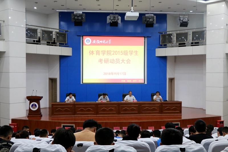 本网讯(437ccm必赢国际版 新闻中心)9月17日下午,437ccm必赢国际版在敬文图书馆报告厅召开了2015级本科生考研动员大会。院党委书记袁德水、副书记崔世兵、副院长高升、毕业班辅导员以及2015级全体同学出席本次会议。学院还邀请了在2018年研究生考试中取得优异成绩的舞蹈表演专业许梦雪和运动训练专业陈琪烨同学为怀揣考研梦想的体院学子做经验分享,会议由崔世兵主持。