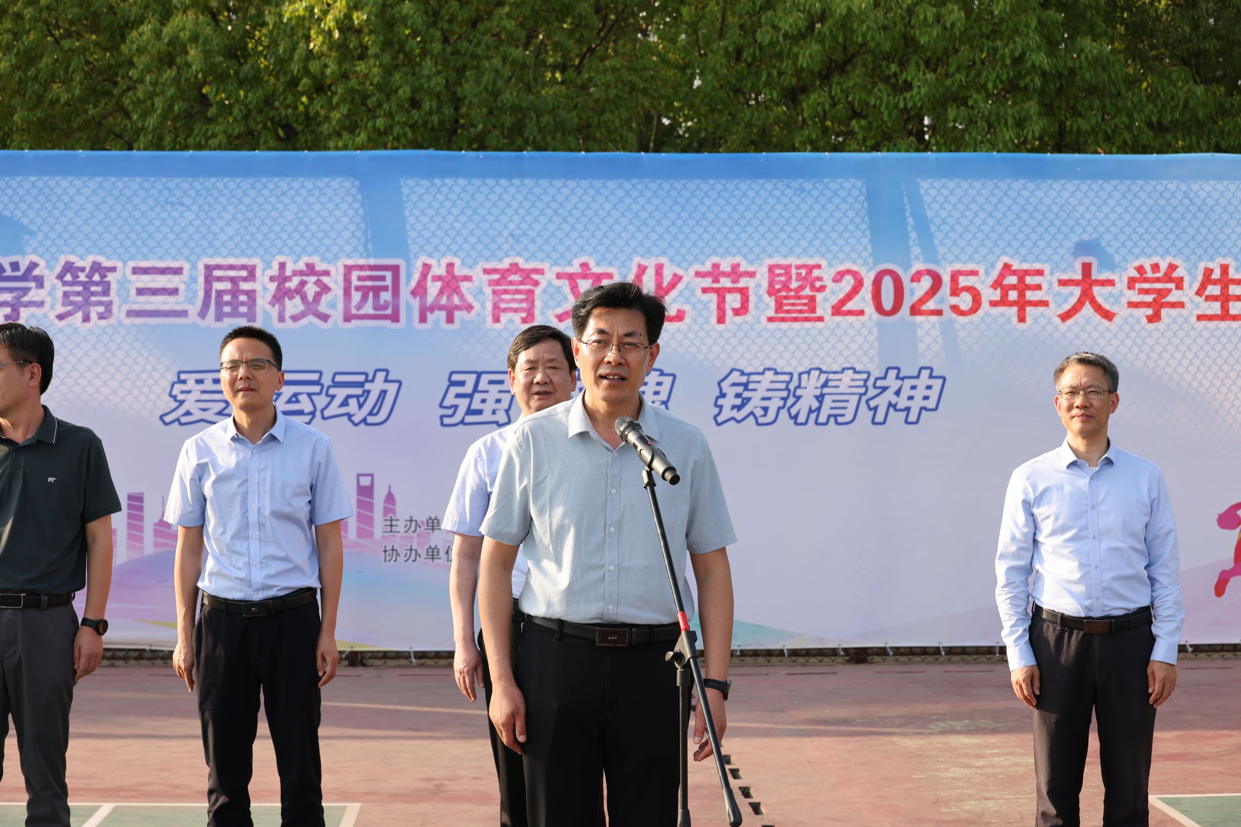 裁判员与各学院代表队有序进场,开幕式在庄严的国歌声中拉开帷幕。黄德春为本次开幕式发表致辞,他强调,党的二十大报告明确对“加强青少年体育工作”作出战略部署,学校更是始终秉承“爱运动、强体魄、铸精神”的体育育人理念,强化五育并举,推动体教融合。希望师生以赛事为起点,发扬体育精神,展现昂扬向上的精神风貌,以更加强健的体魄、更加饱满的热情、更加奋发有为的状态助力学校“三大行动计划”及高水平大学建设。接着,裁判员、运动员代表郑重宣誓。桑青松宣布篮球赛正式开幕,胡靖与桑青松为本次比赛开球。