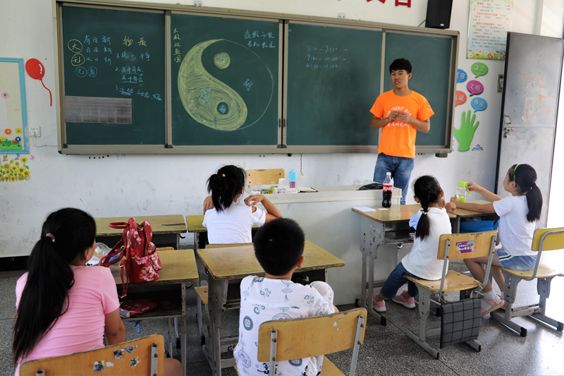 武术班的教学老师钟志浩有着一个六个人的武术小班,在支教活动的七天里,他教会了孩子们一套“五步拳”,看到学生们拳打得有模有样,他也感到十分高兴。每天晚上送完小孩子们回家之后,他坐在办公室里准备明天的教学计划、写今天的总结,把每一个教学活动都安排仔细,认真负责的去教好每一个小朋友们打拳。在日常的教学活动中,他和小孩子们的互动也非常频繁。在武术班上有有一个跳拉丁舞非常棒的小女孩,有时他和这位小朋友也会相互“切磋”他们的舞艺,在平时聊天中,他发现班上那个看起来最小的女孩也是多才多艺,在夏令营文艺汇演中弹了一首电子琴,也赢得了现场观众的掌声。