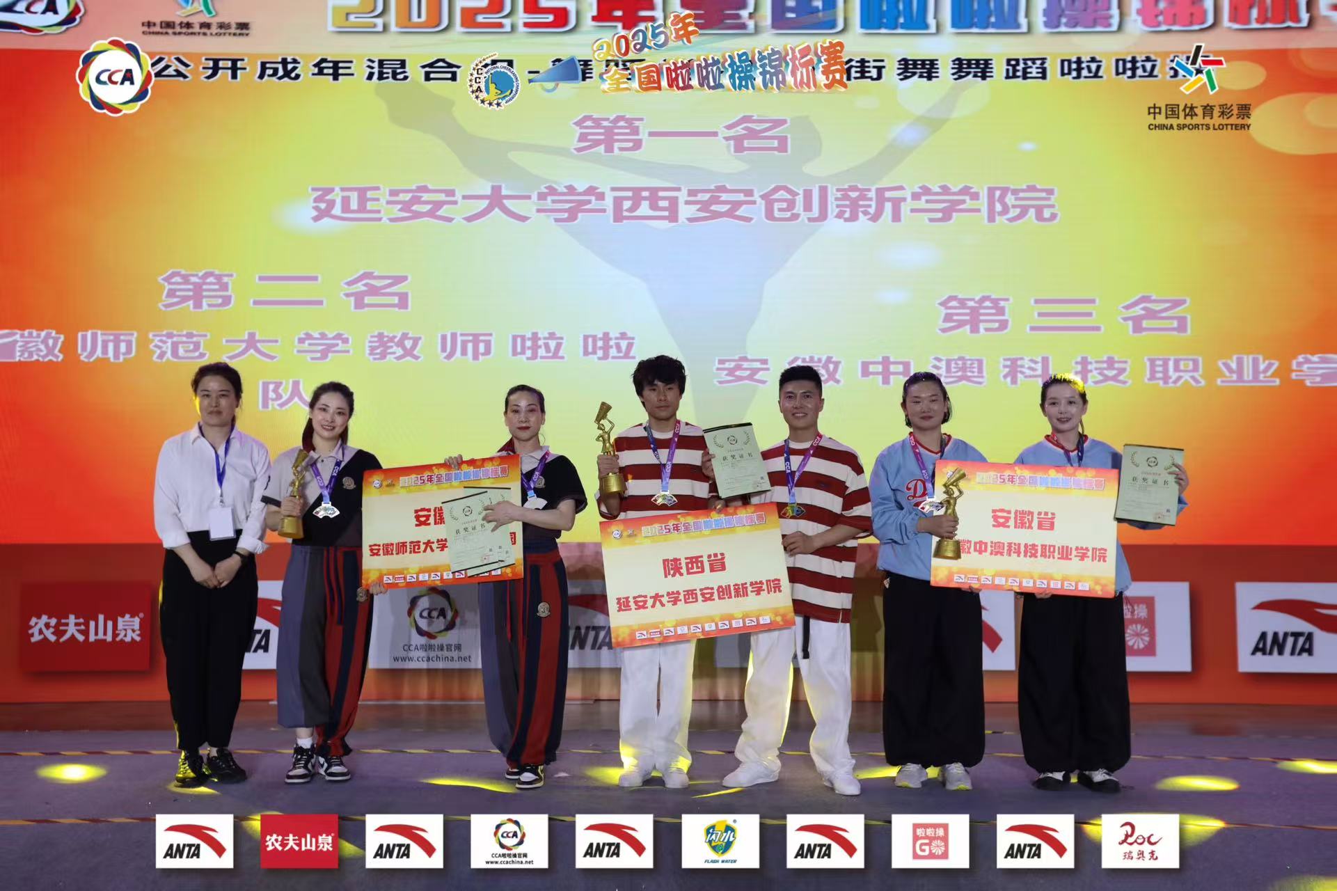 本网讯(437ccm必赢国际版)2025年5月24—29日,由国家体育总局体操运动管理中心、中国蹦床与技巧协会主办的全国啦啦操锦标赛在合肥市举办,吸引了来自全国18个省、市、自治区的7000余名运动员参赛 ,其中不乏多所国内体育院校的队伍。以437ccm必赢国际版教师为主的我校教师代表队在公开成年混合组—全国成年啦啦操示范套路比赛中斩获第一名,437ccm必赢国际版梁颖、程燕两位教师获得公开成年混合组双人街舞啦啦操第二名,为学校赢得了荣誉!