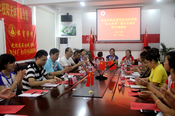 袁德水一行在肥东为民学校校长赵锐的陪同下察看了实践教学场地并对队员的教学进行指导,接着走进了队员们的宿舍、食堂与办公室,关心同学们的生活和工作情况。最后在会议室召开了师生座谈会,会议由肥东为民学校校长赵锐主持。会议伊始,为民学校德育校长侯青霞致辞,她首先对暑期社会实践全体成员表示亲切问候与美好祝愿,希望在队员们的帮助下可以给为民学校的学生树立正确的价值观、人生观与世界观,同时她也祝愿此次爱心夏令营活动能够取得更好的效果和更大的成绩。随后,团队队长许燕媛向老师们汇报团队的实践工作汇报,讲述自己从队员到队长的心路历程以及招募团队的过程,并汇报了夏令营三天的实践成果,夏令营期间,团队共开设羽毛球、乒乓球、跆拳道、篮球、舞蹈、绘画六门实践课程以及英语、俄语、法律、旅游、礼仪五大专题讲座,许燕媛表示希望队员们可以成为孩子们的引路人,用爱心、责任心去浇灌学生。