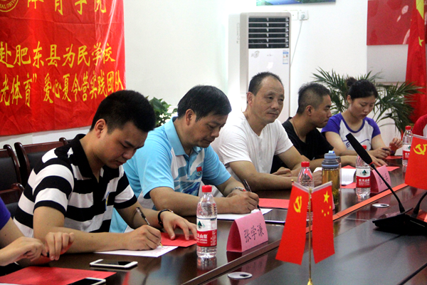 学思结合,知行合一,赵锐校长在最后说道:“为民学校比较特殊,它虽然是一所寄宿制学校,半个月回家一次,但是我们为民学校80%的学生都是留守儿童,10%的学生是单亲家庭,甚至还有极个别学生是孤儿,他们缺少一定的家庭教育,所以在这里我们不仅仅只是教授知识,还要承担起家庭教育的责任。”同时她也解答了队员们关于教学方面的困惑,她表示上课要备教材、备课本,但是更多的还是备学生,她坚信“亲其师,重其道”,只有走进孩子们的心灵,才能做到更好的教学。院党委副书记崔世兵对为民学校的全体师生表示感谢,感谢他们为志愿者提供实践舞台,“星星之火,可以燎原”,他列举了同学从暑期社会实践的营员变成了团队的志愿者的例子,向团队强调了暑期社会实践“受教育、长才干、做贡献、树形象”的目的。最后袁德水老师做总结讲话,他从感谢、感受、希望与祝愿四个方面展开他的总结讲话,要求志愿者真正做到深入实践,了解民情,服务群众,增加才干,奉献智慧,展示形象,同时提醒同学们要珍惜机会、珍爱生命、珍重人生,安全第一,最后他对437ccm必赢国际版“阳光体育”爱心夏令营团队表示衷心的祝愿,希望在开学时看到团队的精彩汇报与丰硕成果。