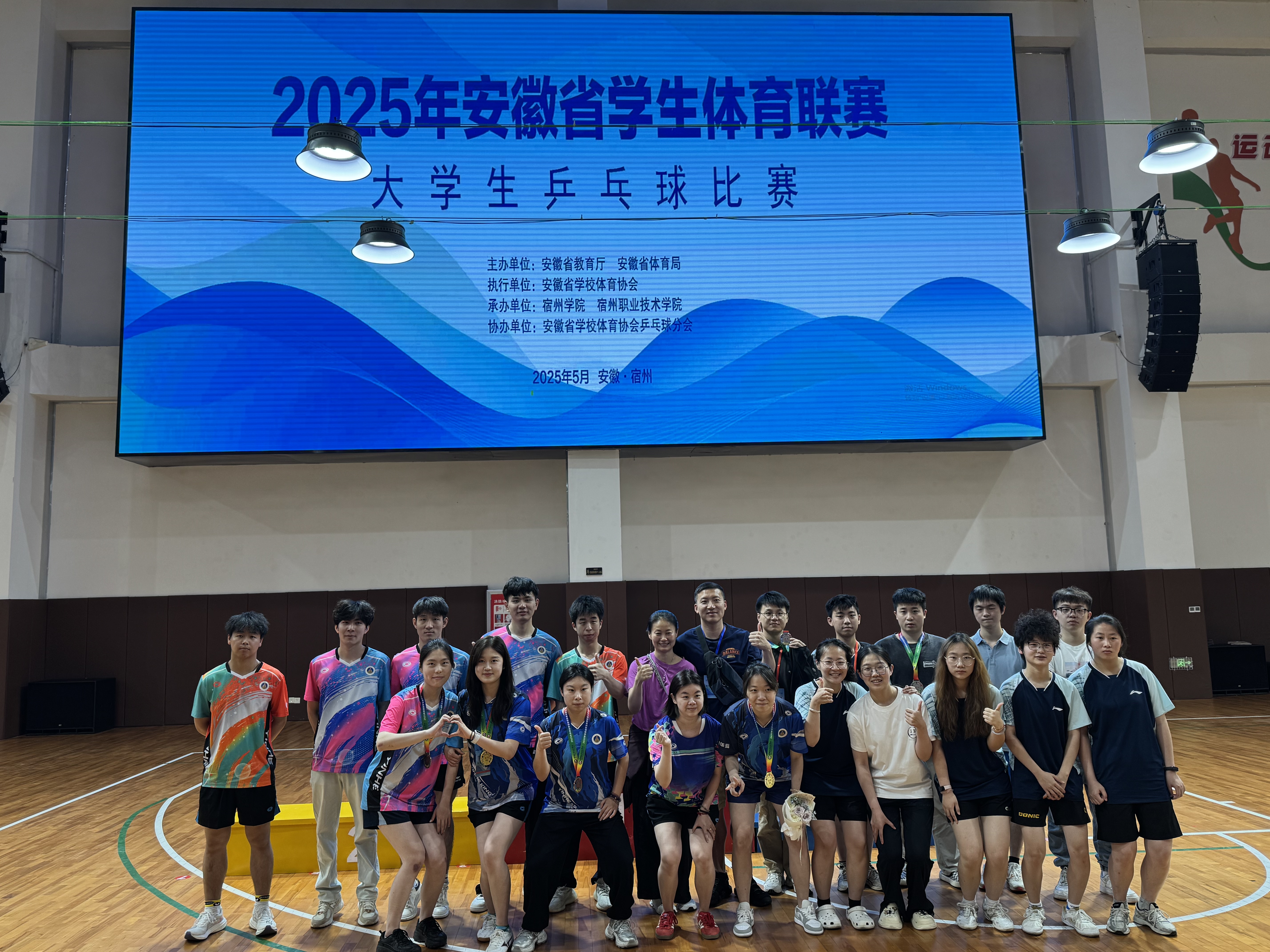 本网讯(437ccm必赢国际版)“2025年安徽省学生体育联赛大学生乒乓球比赛”于5月24日至29日在宿州职业技术学院举行。我校乒乓球代表队参加了甲组和丙组比赛,历经六天的激烈角逐,取得优异成绩。