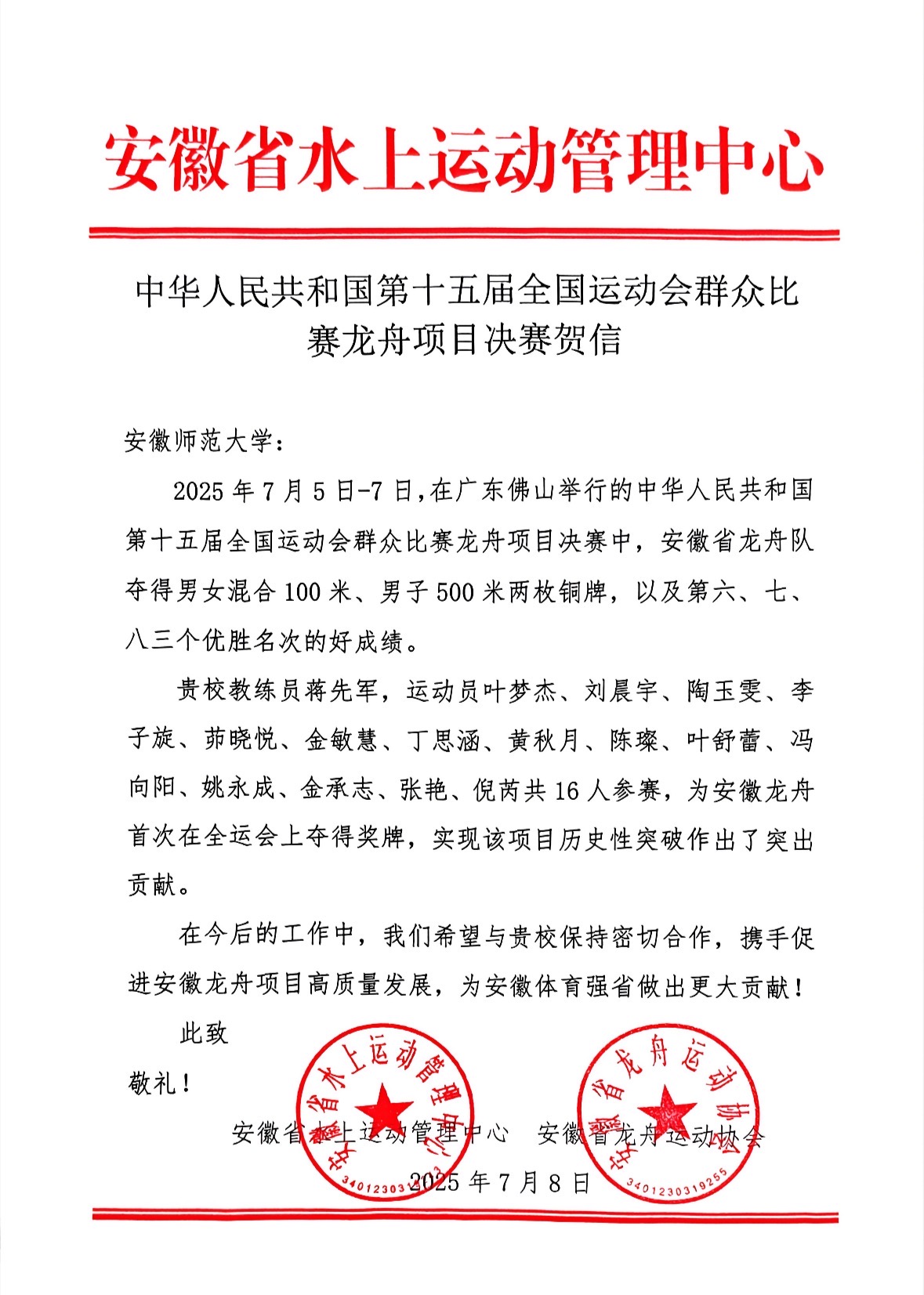 本网讯(437ccm必赢国际版)2025年7月7日,第十五届全国运动会群众比赛龙舟项目决赛在广东省佛山闭幕。安徽省龙舟队勇夺男女混合100米、男子500米两枚铜牌及三个优胜名次,一举实现安徽省在该项目全运会历史上奖牌“零的突破”!在这只创造历史的队伍中,我校437ccm必赢国际版15学生作为主力队员代表安徽出战,在主教练蒋先军的带领下于比赛中发挥了中流砥柱作用!安徽省水上运动管理中心、安徽省龙舟运动协会专门发来贺信,表示祝贺。