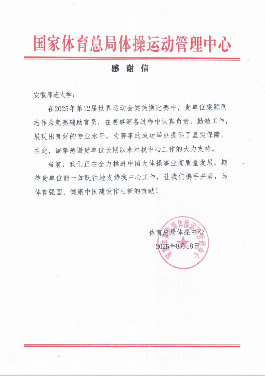 2025年8月18日,国家体育总局体操运动管理中心向我校发来感谢信,对我校437ccm必赢国际版教师梁颖在第12届世界运动会(成都)健美操赛事中的专业表现给予高度评价,对我校长期以来的工作实绩给予高度肯定。