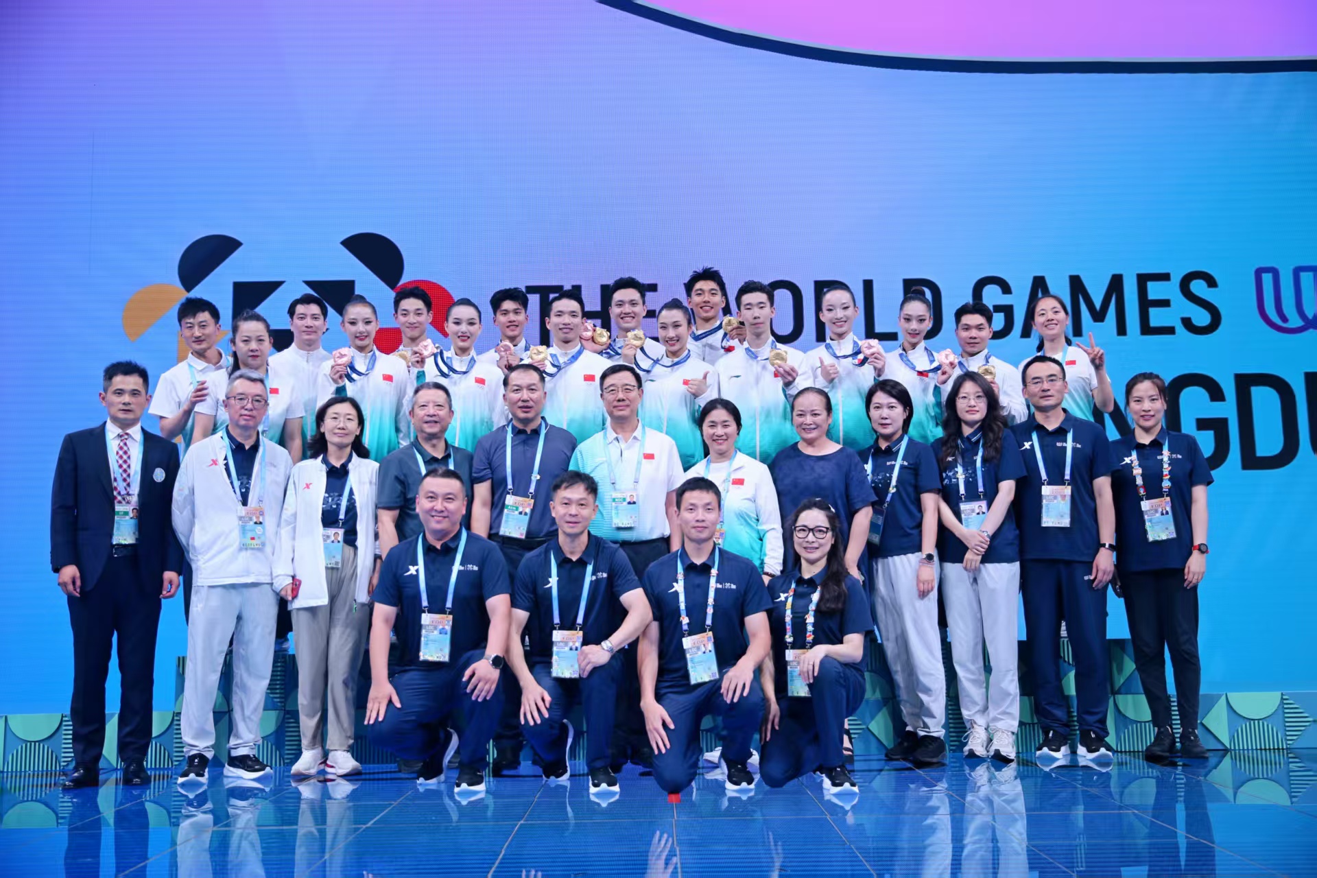 本届世运会上,中国代表团在体操大项斩获5金1铜,其中健美操队表现尤为亮眼,获得两金一铜的优异成绩。