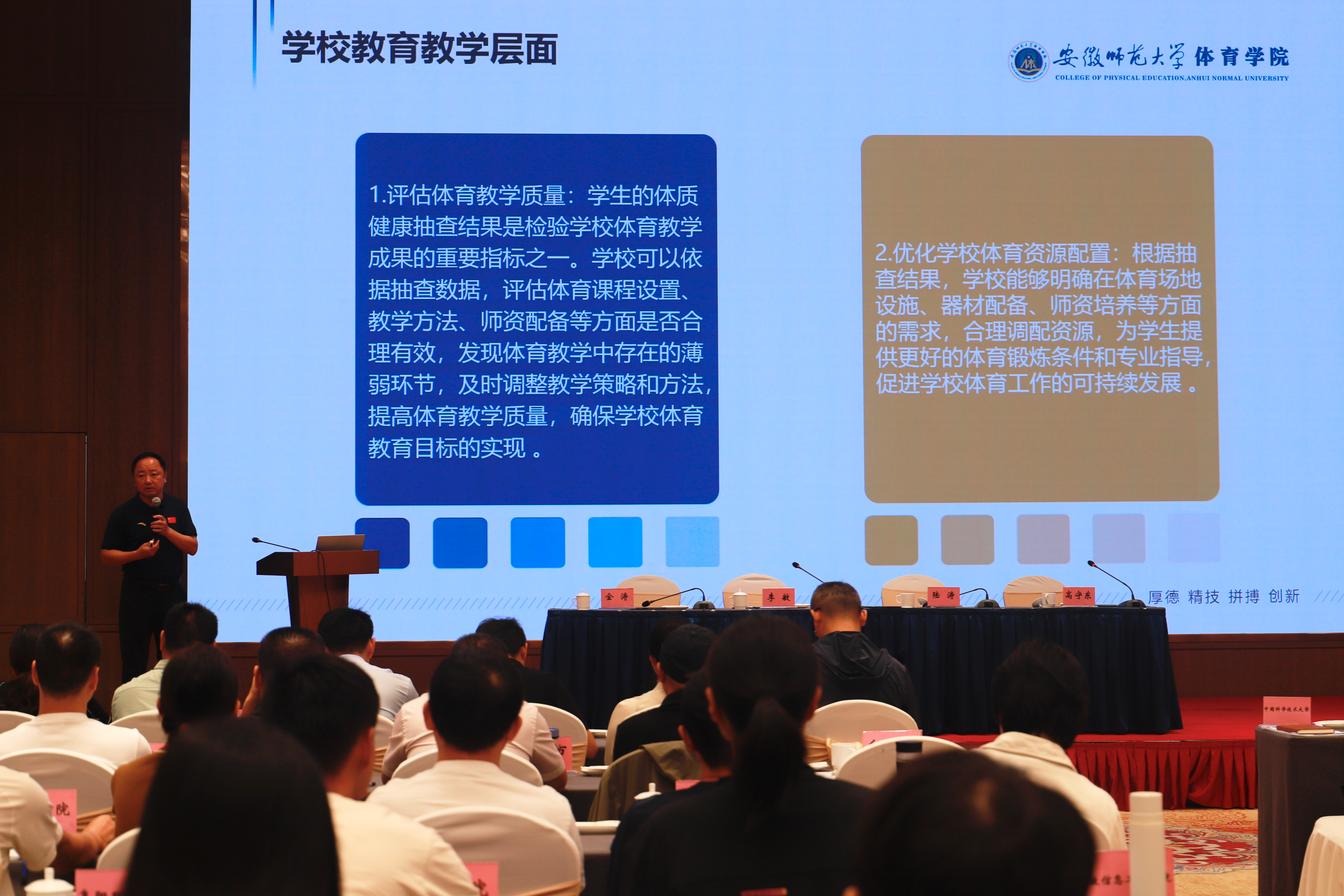 会上,金涛从抽查样本的确定、近三年安徽省学生体质健康基本情况、2024年安徽省学生体质健康排名情况三个方面对2024年全省体测抽查情况进行通报,希望与会各位同仁切实重视学生体质健康监测工作,根据各校实际,多措并举,把我省学生体质健康的真实水平反映出来,以便为下一步促进学生体质健康发展举措提供有效的决策支撑。六安市、马鞍山市教育局、淮北师范大学、滁州学院、安徽交通职业技术学院、滁州城市职业学院等单位围绕学生体质健康促进工作进行了交流发言。