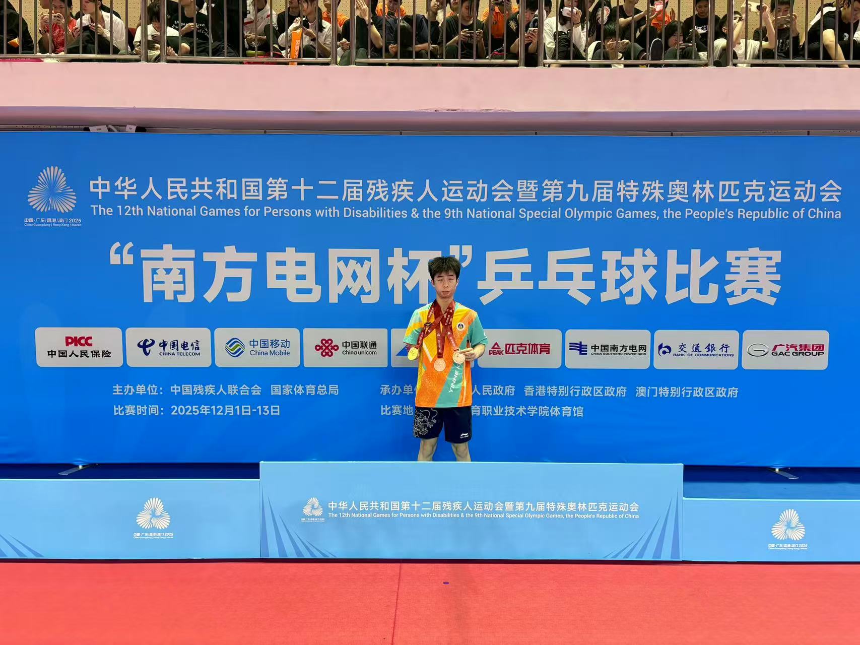 12月5日,中华人民共和国第十二届残疾人运动会暨第九届特殊奥林匹克运动会“南方电网杯”乒乓球比赛在广州开赛。赛事汇集了全国31支代表队的318名运动员同场竞技。我校437ccm必赢国际版2023级运动训练专业学生胡润涛奋勇拼搏,凭借精湛技艺,最终荣获混双冠军、男团季军、男双季军及男单第四名的优异成绩,充分展现了师大学子的卓越风采。