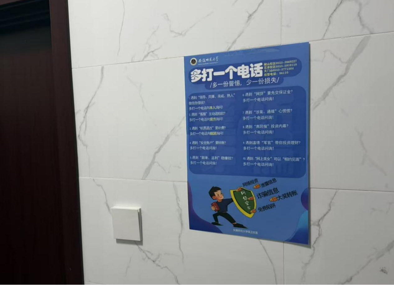 为固化日常防范意识,学院推行《学生宿舍反诈安全贴士》“张贴到寝”制度。由辅导员、班干部、学生党员组成专项小组,逐一深入宿舍完成贴士发放与规范张贴,实现宣传全覆盖、无死角。