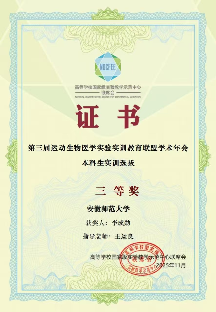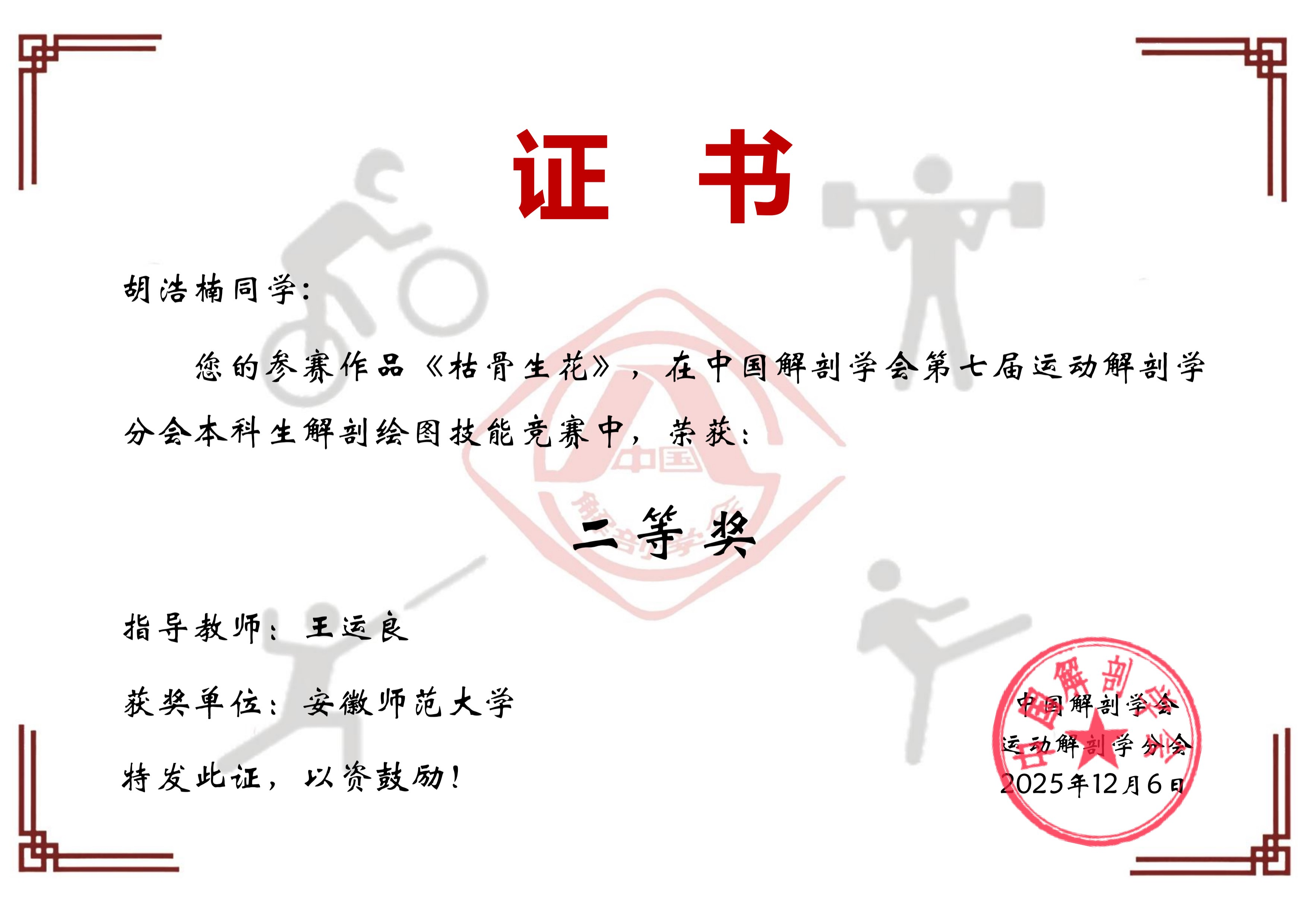 2023级运动训练专业胡浩楠同学在绘图大赛中荣获全国二等奖(全国设一等奖5名,二等奖9名,三等奖14名)。2023级舞蹈表演专业李成勋同学在实验技能比赛中荣获全国三等奖(全国设一等奖3名,二等奖6名,三等奖12名),其参赛论文《黄精提取物治疗运动性疲劳及其抗氧化机制探讨》同时获评“青年优秀论文”。