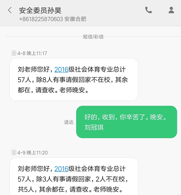 主题班会教育结束后,实习辅导员刘冠琪在现任辅导员陪同下,深入学生宿舍进行安全隐患排查和卫生检查,在检查过程中,对发现的可能存在的问题讲清楚,说到位,确保安全工作无死角。此外,实习辅导员到岗后,2016级社会体育专业实行“零点报告”双报告,安全委员孙昊在给原辅导员发送零点安全短信同时,给实习辅导员刘冠琪发送安全短信,真正将安全工作落实到平时,具化至细节。
