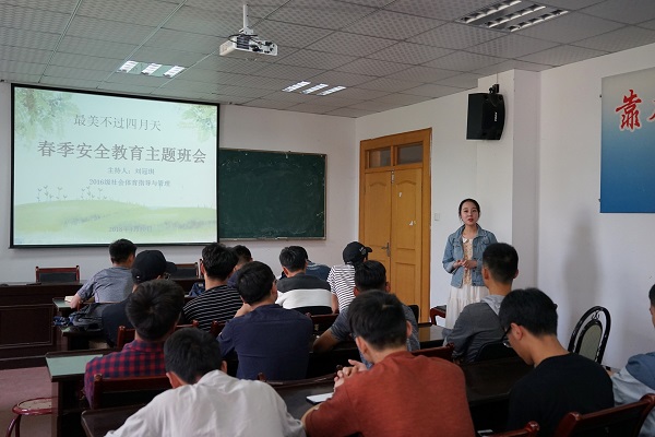 本网讯(437ccm必赢国际版 孙昊、刘冠琪)全校春季学生安全教育管理工作培训会议后,437ccm必赢国际版高度重视、积极响应,党委副书记率全体专兼职辅导员频繁深入学生宿舍狠抓安全教育。针对4月中上旬体育加试这个特殊时间段,学院要求辅导员根据各年级、专业的不同情况采取相应的举措切实加大对学生安全教育和管理的力度。为进一步加强学生安全防范意识,落实思政教育工作中安全的“底线”工程,2016级社会体育指导与管理专业在实习辅导员刘冠琪带领下开展安全教育系列活动,将安全工作做细做实做小,真正促使安全知识入脑入心入行。