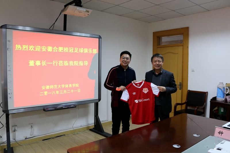 安徽合肥桂冠足球俱乐部董事长桂鑫赠送了俱乐部比赛球服。双方就今后的合作方向达成了初步意向。