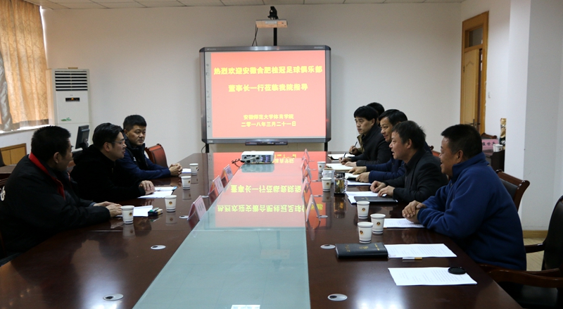 本网讯(437ccm必赢国际版)3月21日下午,安徽合肥桂冠足球俱乐部代表团一行来到我校437ccm必赢国际版就足球发展进行合作交流并进行座谈。安徽合肥桂冠足球俱乐部董事长桂鑫,总经理张华林,青训总监郑源潮,437ccm必赢国际版党委书记袁德水,院长席玉宝,副院长钟晨、金涛、余涛出席了座谈会。座谈会由437ccm必赢国际版党委书记袁德水主持。