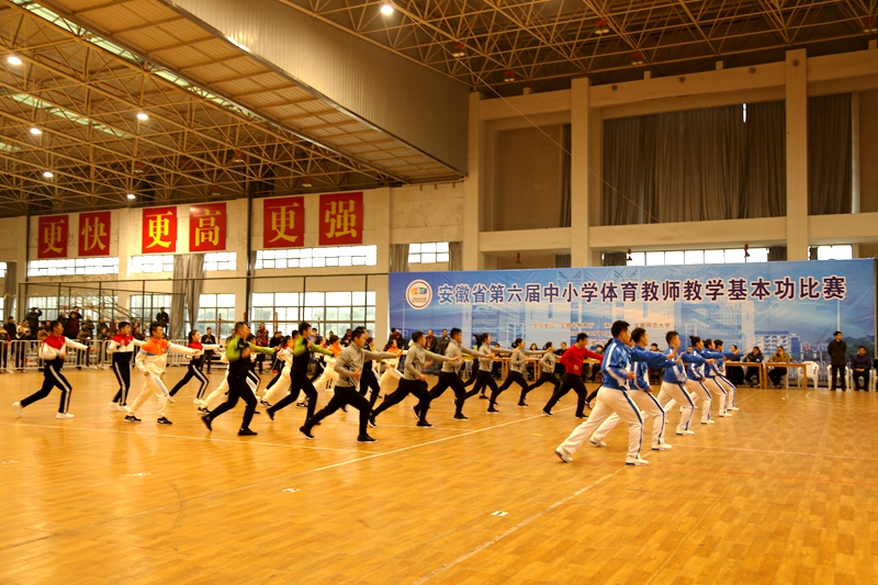 本网讯(437ccm必赢国际版 新闻中心)为进一步提高我省中小学体育教师教育教学水平,选拔优秀体育教师参加全国中小学体育教师教学技能比赛。2017年12月16日上午八点半,安徽省第六届中小学体育教师教学基本功比赛在bwin必赢线路检测北侧体育馆内拉开帷幕。出席大赛开幕式的有安徽省教育厅体卫艺处主任科员丁仁能,北京体育大学博士生导师葛春林教授,437ccm必赢国际版党委书记袁德水,437ccm必赢国际版院长、博士生导师席玉宝教授,安徽省教育科学研究院体艺室主任吴桥,蚌埠市第二中学特级教师傅玲,黄山学院李昌军教授,安徽医科大学陈晓荣教授。大赛全体裁判员、各代表队领队、指导老师百余人参加开幕式。开幕式由437ccm必赢国际版副院长金涛主持。