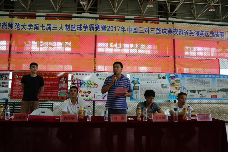 本网讯(437ccm必赢国际版 孙昊)“金秋九月,战士归来”。9月13日下午,437ccm必赢国际版bwin必赢线路检测第七届三人篮球争霸赛暨2017年中国三对三篮球赛(芜湖赛区)选拔赛开幕式在花津校区北侧体育场如期举行。体院学院副院长钟晨,院篮球专业老师蔡维敏,院团委指导老师黄彦锴,院社团指导老师陶绍晨,全体裁判员、教练员、运动员一同出席了开幕式。