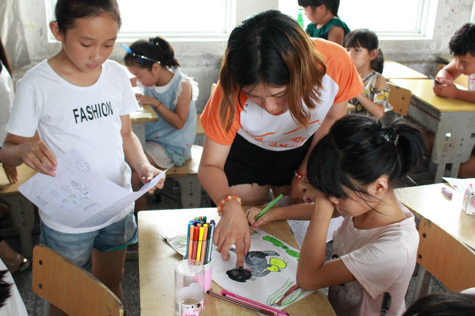 天气炎热,老师们既要照顾到孩子们的身体,又要准备充足有趣的课堂教学内容,还要在下课后保证每一个孩子都能安全到家,仅仅半天就让每个老师都筋疲力尽。但尽管如此,绘画班的老师仍然坚持把每个学生的作品都单独拍下来发给家长、羽毛球班的老师则因为陪同最后一个孩子等待家长以至于错过了吃饭时间,每一位老师都为了班里的小朋友们费心尽力,要保证他们的安全,要让他们感到快乐,更要让他们真真切切地有所收获。
