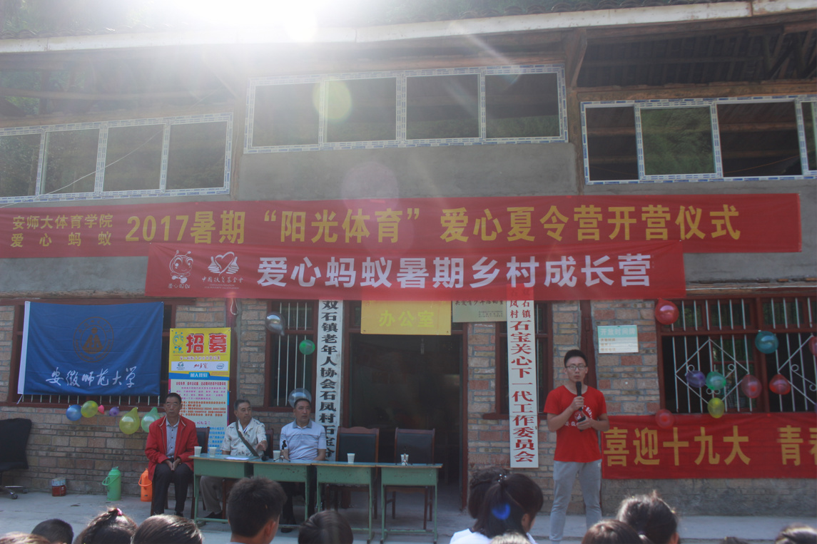 7月11日上午9时30分,2017年“阳光体育”爱心夏令营开营仪式在双石镇石宝村的老年协会中心举行。芦山县群团组织相关负责人、石宝村委员会、老年协会的各位领导,以及雅安市爱心蚂蚁发展服务中心负责人以及报名参加“阳光体育爱心夏令营”的山区孩子们参与仪式。在一片欢乐的气氛中,开营仪式的各项流程依次有序进行。首先由各级领导发言致辞,其次是队长对“阳光体育”理念的介绍,然后是团队成员们的自我介绍,成员们在介绍完自己的身份后,还对未来20天中自己所教授的课程进行了简单的描述,以便孩子们对夏令营的内容有大致的了解。随后是志愿者宣誓仪式。在鲜艳的志愿者旗帜下,成员们身着统一的志愿者服装,念出庄严的誓词:“我志愿成为一名光荣的社会实践志愿者,秉承优良传统,发扬志愿精神,听从安排,遵守纪律,牢记使命,尽己所能,为帮助他人服务社会而努力!”