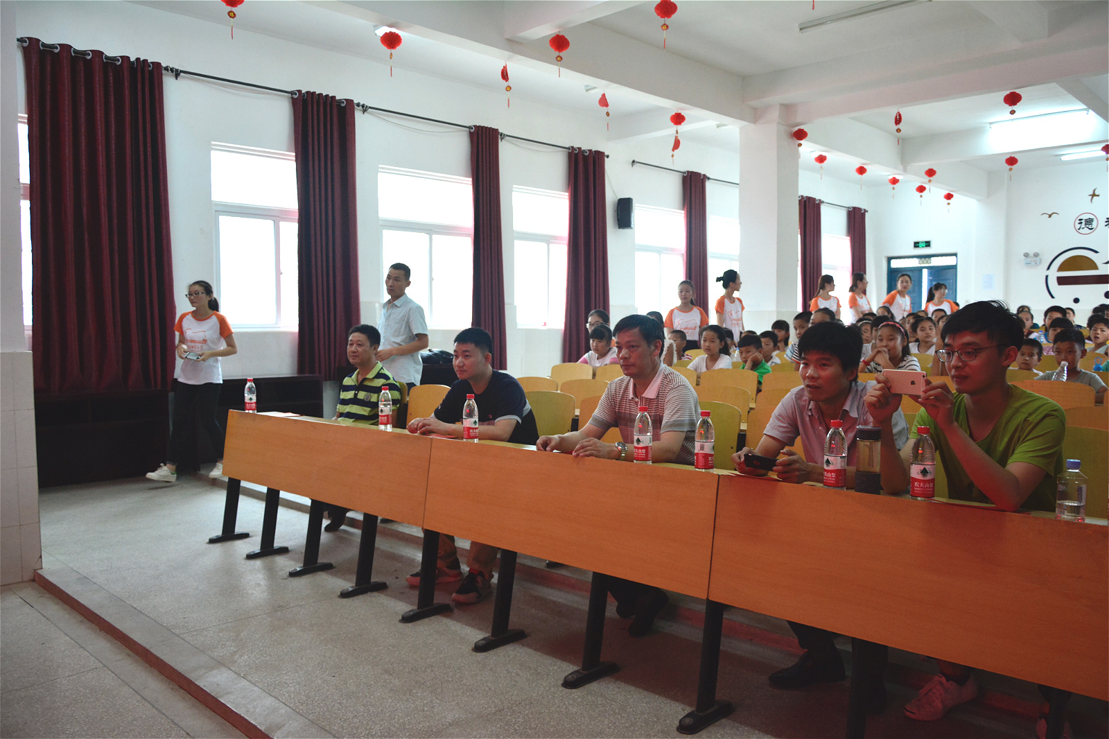 在铭传乡党委委员翟玉容等陪同下,袁德水一行观看了团队的实践汇报演出。各个兴趣班的孩子们用不同形式的节目展示了自己十天的所学成果,他们以饱满的精神状态、整齐划一的动作赢得了观众们的一片掌声。