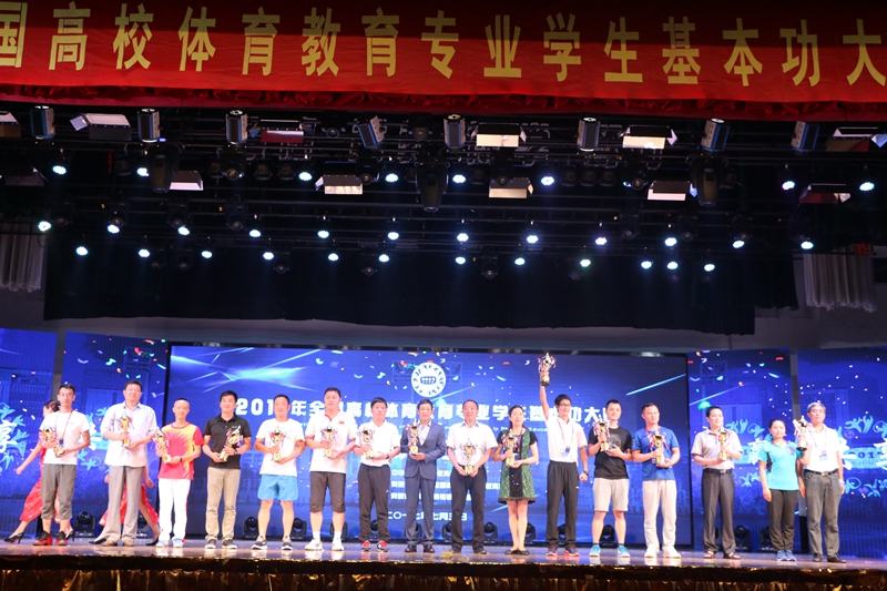 大赛副秘书长、437ccm必赢国际版副院长金涛教授宣读各参赛学校团体总分以及获奖名单。基础理论知识竞赛中,南京晓庄学院等3所学校获团体一等奖, 山西大同大学等5所学校获团体二等奖,莆田学院等15所学校获团体三等奖;运动技能类竞赛中,台州学院等3所学校获团体一等奖,河池学院等5所学校获团体二等奖,邵阳学院等15所学校获团体三等奖;团体总成绩中,南京晓庄学院等3所学校获团体一等奖,泰山学院等5所学校获团体二等奖,山西大同大学等15所学校获团体三等奖;精神文明评选委员会主任范峰同志宣读体育道德风尚奖获奖单位,23所参赛学校共同获得“体育道德风尚奖”;我校作为承办单位,获教育部颁发“特别贡献奖”。