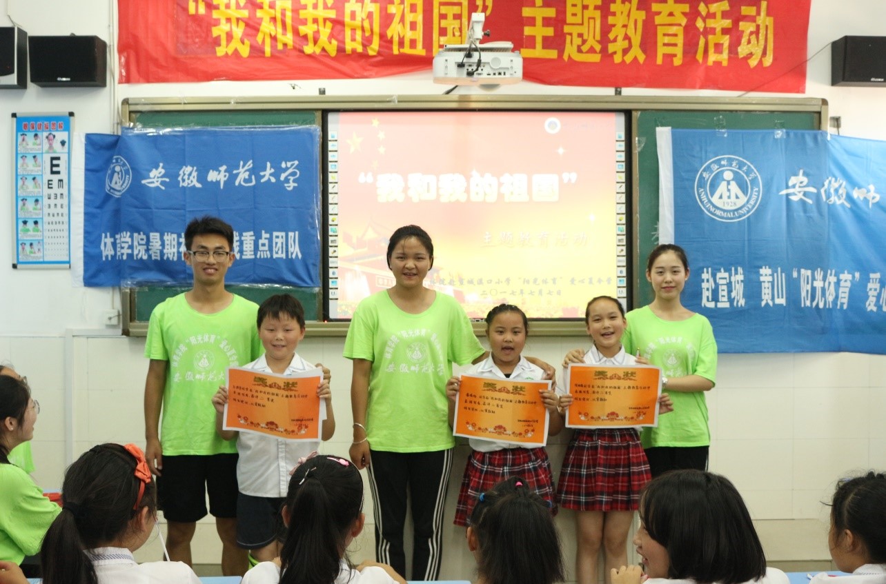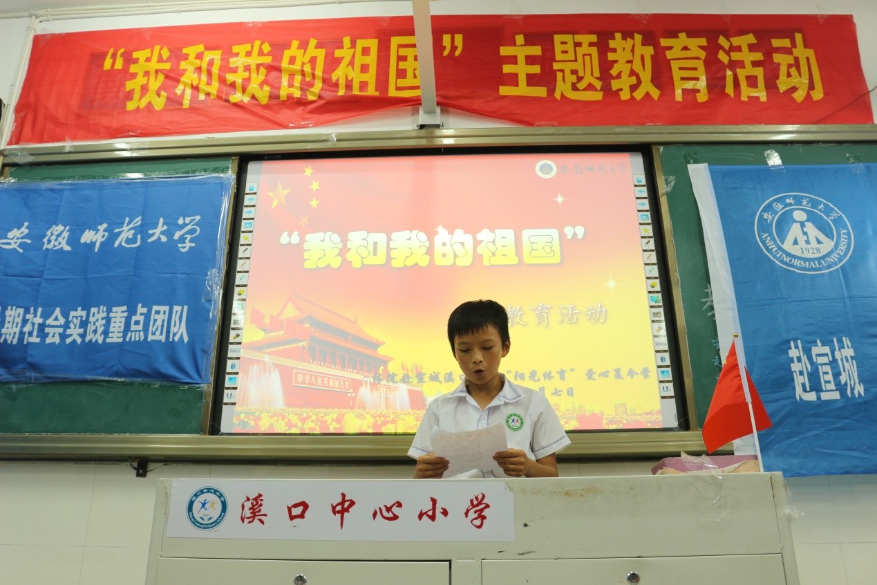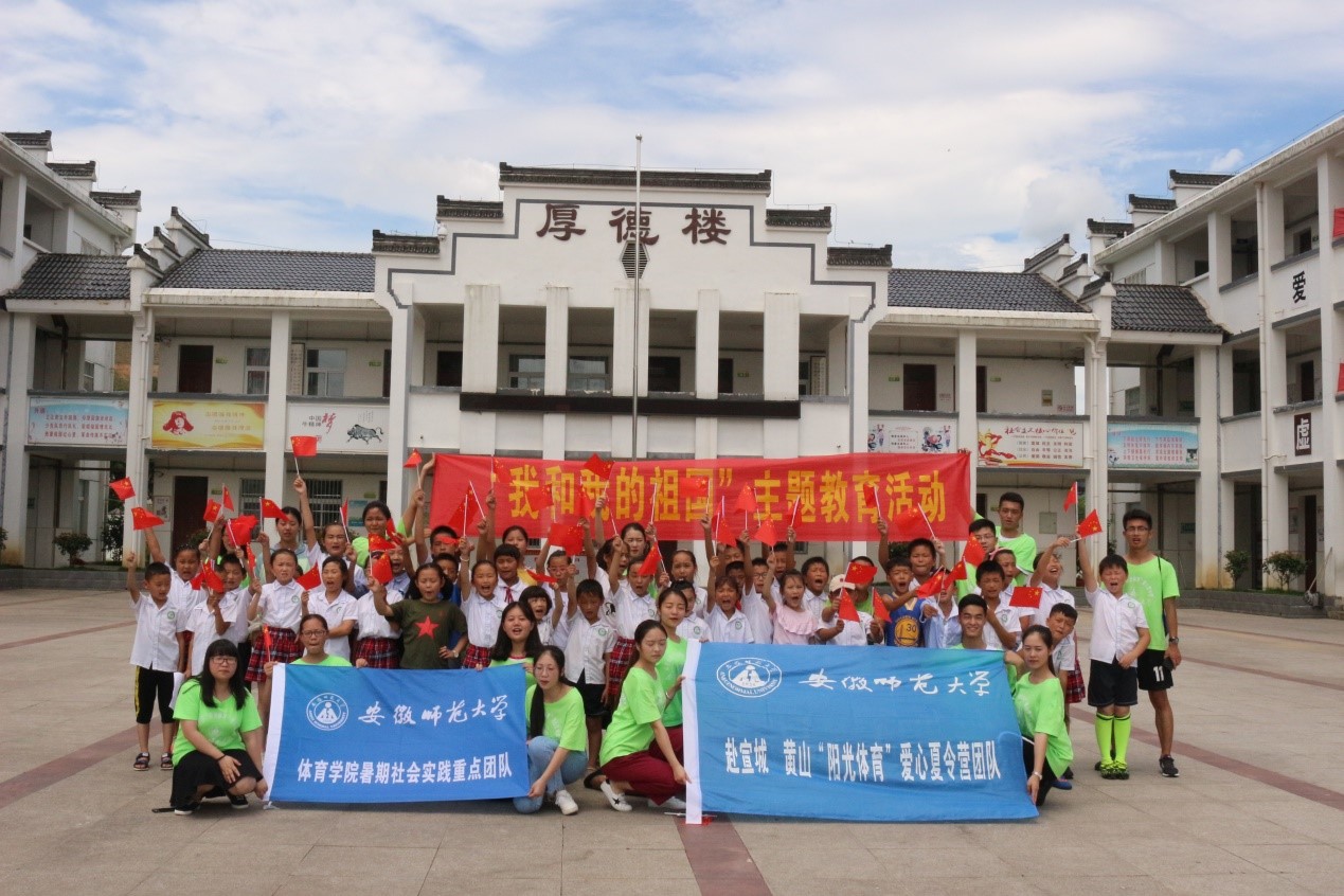 (本网讯 文/乔静、黄思蕾图/许有雨)为增强学生的爱国意识,培养学生的爱国情怀,2017年7月7日,借“七七”事变这段历史,在体育特色课程结束后,安徽师大体院赴溪口爱心夏令营实践团队举办了以“勿忘国耻,圆梦中华”为主题的爱国教育系列活动。