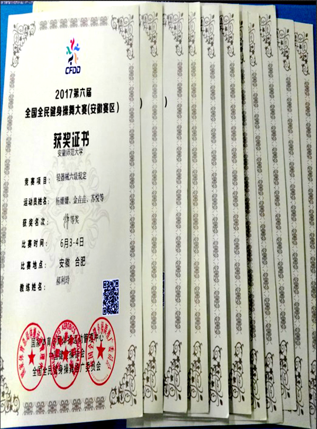 本网讯(437ccm必赢国际版 左宗玲)6月3日至4日,2017年第六届全国全民健身操舞大赛(安徽赛区)的比赛在安徽省粮食工程学院举行。我校由14级体育教育健美操专选班、15、16级体育表演专业组成的437ccm必赢国际版代表队,分别获得轻器械六级、轻器械四级、爵士舞三项特等奖、自选套路一等奖的好成绩。