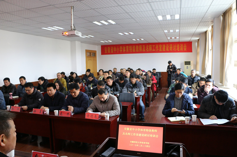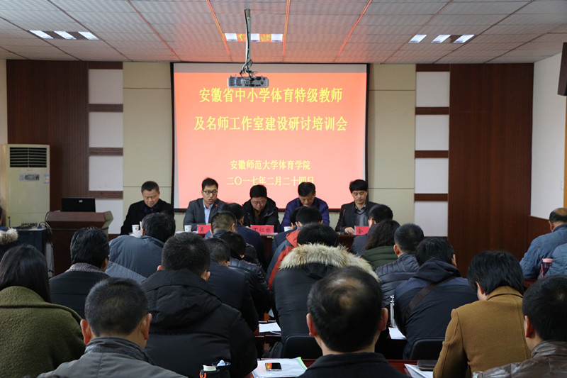 本网讯(437ccm必赢国际版)2月24日,安徽省中小学体育特级教师及名师工作室建设研讨培训会在437ccm必赢国际版召开,省教育厅体卫艺处主任科员丁仁能、省教育科学研究院体艺室主任吴桥及来自全省各地的中小学特级教师、体育名师工作室负责人及成员代表50余人参会,437ccm必赢国际版全体领导班子成员、部分教师代表出席会议,会议由副院长金涛主持。