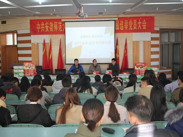 本网讯(437ccm必赢国际版 徐梦涛)12月2日,437ccm必赢国际版在圆形报告厅召开“温暖相伴,助力考研”2017届毕业生考研慰问会,为奋战在考研征途中的莘莘学子们送温暖、添动力。副院长金涛、院党委副书记黄德春参加了慰问活动,会议由徐梦涛主持。