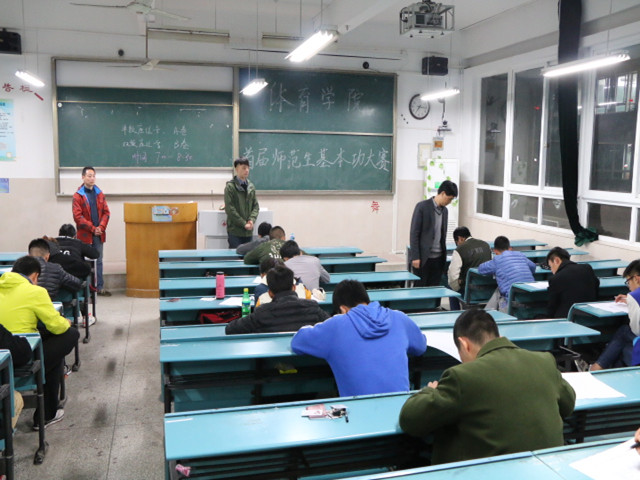 本次基本功大赛单人组的比赛还安排了基础理论综合知识的考试。12日晚7点,理论考试在教学楼3号楼的四个教室同时进行。本次考试根据组别不同其内容也不同,二年级的理论考试内容为《运动解剖学》和《体育概论》,三年级的理论考试内容为《运动生理学》和《健康教育学》。此次考试严格按照考试流程进行,为参赛选手提供一个检验自我的真实考场。考试过程中,同学们全神贯注地答题,自觉遵守考试纪律,整场考试有条不紊的进行着。