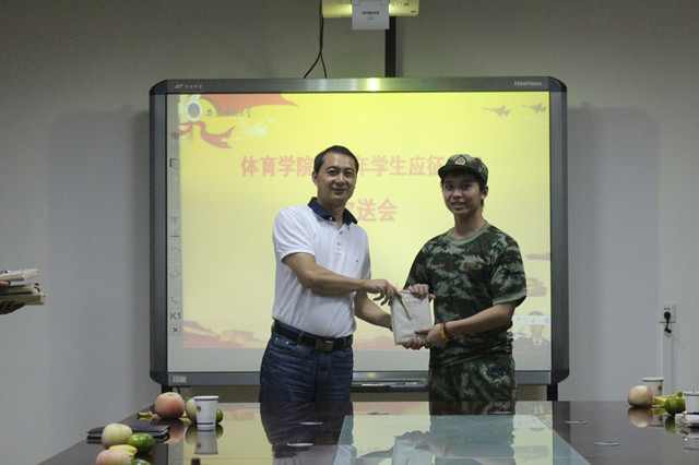 接着,黄德春代表全院师生对携笔从戎,即将奔赴四川、海南、新疆等地的新战士表示祝贺。并对入伍学生提出三点要求:一要尽快适应军旅生活,加强学习,磨炼意志品质;二要努力提升专业本领,忠于职守,苦练军事技能;三要积极创造美好历程,立志军营,建功立业。希望同学们珍惜荣誉,牢记使命,经受住严峻的挑战,磨砺出坚强的意志和品格,为祖国和学校争光。最后,黄德春为入伍学生颁发纪念品,并合影留念。