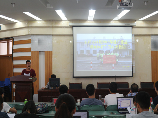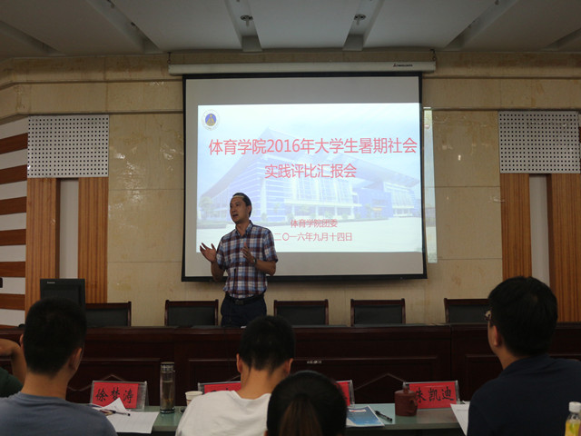 本网讯(437ccm必赢国际版 文/葛晓婕 图/朱港晨中)奉献社会中国梦,青春志愿阳光行。9月14日下午,体育学院在圆形报告厅举行2016年暑期社会实践评比汇报会,院党委副书记黄德春及全体专兼职辅导员出席汇报会,会议由朱凯迪主持。