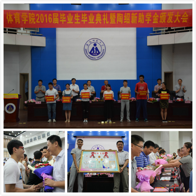 “亲爱的同学们,陶绍新先生作为学院知名校友,通过个人不懈努力,不仅为国家,为社会创造了巨大财富,还不忘感恩社会,回报母院,捐资100万元在母院设立陶绍新助学基金……希望广大毕业生将这种自信自强、艰苦创业的体院精神传递下去,争做勇担责任的男儿,学院闪亮的名片”学院党委书记袁德水在2016届毕业生典礼暨陶绍新助学金颁发仪式上语重心长地说。典礼上,毕业生代表将一幅《冠军之路》荣誉奖牌匾捐赠给母院,一枚枚奖牌、一张张证书见证了体院人在运动赛场上奋勇拼搏的体育精神,表达了毕业生对母院辛勤培育的感恩之情。学院深化毕业典礼育人功能,将校友陶绍新助学金颁发仪式同毕业典礼相结合,引导毕业生常怀感恩之心,强化社会责任意识。