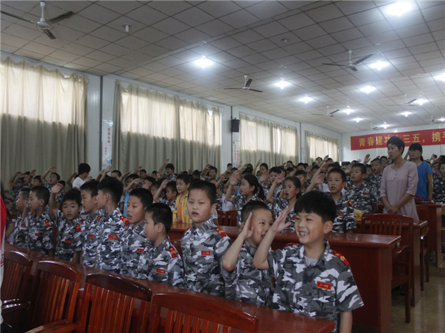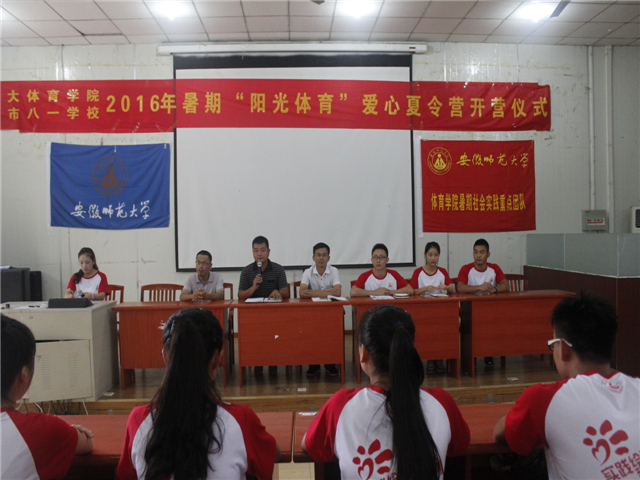 安师大体院赴合肥八一学校爱心夏令营7月4日上午在八一学校高中部多媒体教室开营,学校常务副校长费法志,德育处主任张聪,后勤主任盛绍玉,全体队员以及可爱的小朋友们参加了此次开营仪式。