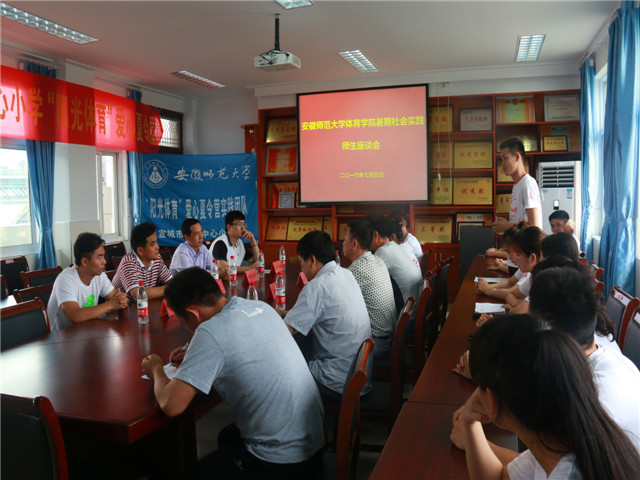 座谈会伊始,团队成员们依次谈了个人实践的感悟。其中,团队负责人杨帆代表发言,他说道从前期准备到队伍的最终建立,要感谢每一位队员的努力付出,同时提出作为校重点团队,压力与责任并存,面对接下来的每一个环节都不能懈怠。接着,副院长高升强调了打造“第三课堂”的重要性,更强调了学校对人才培养的重视以及暑期社会实践的必要性。他指出“参与一次,收获一次,成长一次。”要在保证安全的前提下秉承“自强不息、追求卓越”的师大精神,用心并毫无保留的对支教地区的孩子们贡献出自己的力量。接着,戴兆国老师在肯定了“阳光体育”爱心夏令营团队的支教成果后,也结合自身的经历故事指出了农村教育不容忽视,同时鼓励大家在实践中要多亲近自然、亲近人,没有切实的体验感悟的人很难在社会中发挥自己的作用。他还勉励志愿者们还要读自然、社会、报刊、心灵这“四书”,将厚德、重教、博学、笃行的师大校训发扬光大,最后他也表达了对当地校方的感谢。