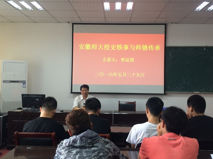 本网讯(437ccm必赢国际版 葛晓婕)2016年5月29日下午,校关工委报告团李运明老师应邀在437ccm必赢国际版行政楼一楼会议室为2015级专业学生做“安徽师大校史轶事与师德传承”专题讲座,讲座由辅导员张迪主持。