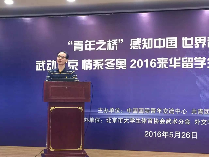 本网讯(437ccm必赢国际版)“‘青年之桥’感知中国,世界青年大讲堂暨武动北京·情系冬奥”2016来华留学生国际武术文化讲坛,于5月26日在北京21世纪饭店隆重举行。我校437ccm必赢国际版王国凡教授作为京外唯一专家代表在大会上作了题为《国际竞技武术(套路)服饰标准化之美学设计思考》的主旨报告,反响热烈。