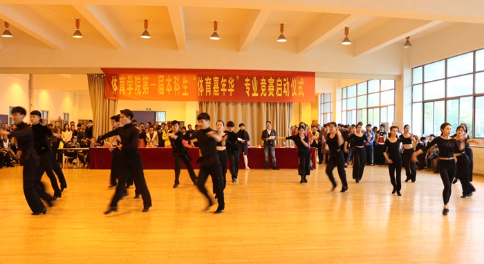 下午两点半,伴随着运动员进行曲,来自全院各个年级专业的10支代表队在引导员的指引下有序进入场内,院党委书记袁德水致开幕词。他表示体育舞蹈作为综合的高雅艺术,能够开阔同学们的视野,陶冶情操并焕发活力。“体育嘉年华”专业竞赛的开展,不仅为同学们提供了展示专业技能的平台,更是积极推进学校“三个课堂联动”机制。他希望此次体育嘉年华活动能够按照活动多项目开发,技能多角度展示,学生多人数参与的“三多”原则,逐步打造成学院一道亮丽的学生活动风景线。院党委副书记黄德春为同学们详细介绍了“体育嘉年华”系列专业竞赛活动开展的背景和意义。随后,裁判员代表和运动员代表分别上台,庄严宣誓,副院长余涛宣布大赛正式开幕。随后,第七届“友谊杯”体育舞蹈大赛拉开序幕,经过三个小时的激烈角逐,朱珊珊、伍晨晨等人获得冠军。