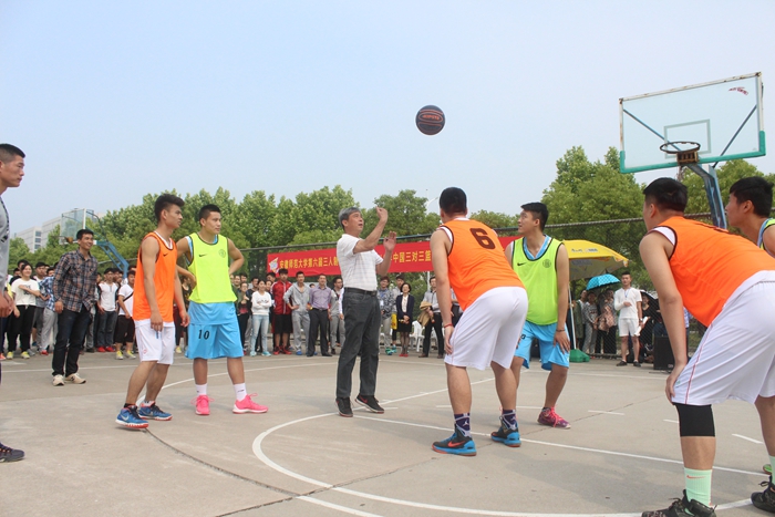 体育学院党委书记袁德水致开幕词。他向全体参赛选手介绍了本次活动目的,一是加强校园体育文化建设,二是扎实做好团员青年的“三走”活动,三是为喜爱篮球的学生搭建一个锻炼身体,提升技能,增强交流的平台。同时,他希望同学们以此为载体,走下网络、走出寝室,走向操场,锻炼身体,提升球技,结下友谊。后由副校长朱家存宣布开幕并为首场比赛跳球。