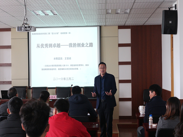仪式结束后,王管谈先生作了题为“从优秀到卓越——我的创业之路”专题讲座,他通过“我是谁、我有什么、我能干什么”引发广大学员思考创业者应具备的基本能力和素质,通过互动小游戏让学员们了解想创业就应该拿出实际行动,他还引用马云“人生不是你获得了什么,而是你经历了什么”告诫学员创业是一个艰苦的过程,只有不惧一次次的失败,才有成功的希望。王总带来的创业经验分享引起了在场学员的强烈共鸣,现场掌声不断。