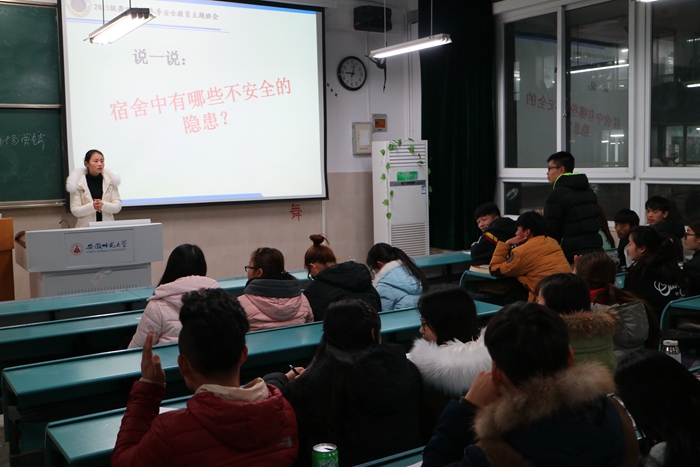 班会上,张老师首先提出,冬季来临,班级同学应该注重哪些安全隐患,并与同学一同讨论宿舍的安全重要性;其次,张老师以提问方式指出,在我们大学生的宿舍中存在哪些安全隐患,并引出违规物品等问题;其后,张老师利用丰富的PPT课件,生动形象地表明使用违规电器对个人生命安全带来的隐患,并结合《bwin必赢线路检测学生手册宿舍管理规定》喻之以情晓之以理,让同学们加强了安全用电意识。最后在班会结束之际,在此强调并要求同学们贯彻落实“离校登记制度”、“请销假制度”、“校外住宿审批制度”、“零点不归报告制度”等四项务必执行制度,并强调任何情况,要第一时间与辅导员联系,保证所有安全隐患第一时间排除。