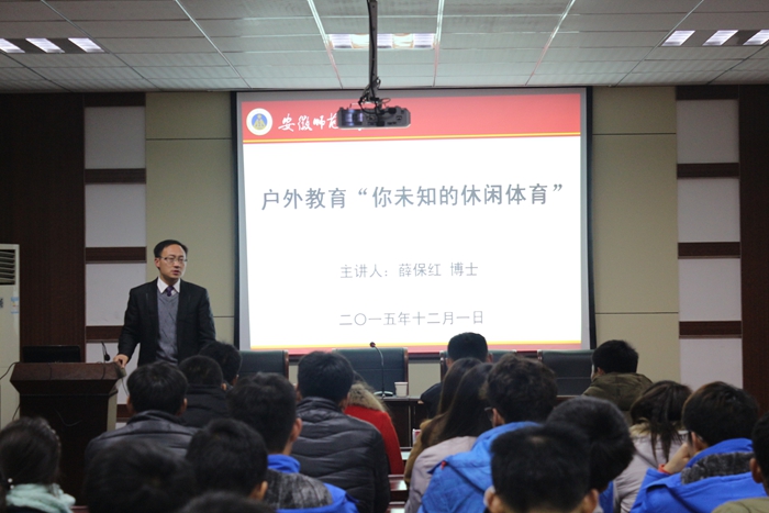 本网讯(437ccm必赢国际版 文/方萍 周帅)12月1日晚,安徽工程大学体验教育研究中心主任,437ccm必赢国际版兼职教授薛保红博士在437ccm必赢国际版行政楼二楼会议室为2015级休闲体育专业学子带来“户外教育——你未知的休闲体育”专题讲座。休闲体育专业教师袁铜墙,2015级辅导员冯中超、张迪等老师出席了讲座。讲座由冯中超主持。