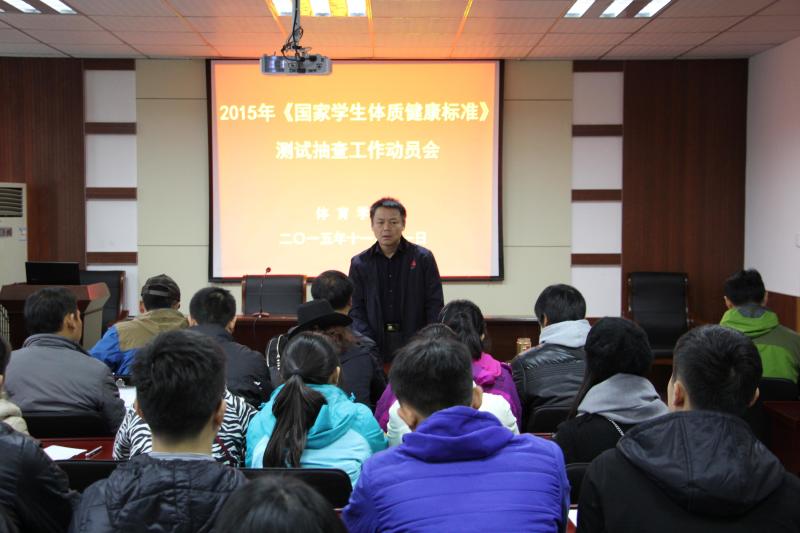 今年是我院连续第三年作为教育部国家学生体质健康标准测试工作组,学校及学院领导高度重视体测工作,要求认真贯彻教育部《关于开展2015年< 国家学生体质健康标准(2014修订)>测试抽查复核工作的通知》精神,积极组织业务学习与培训,严格按照规范要求做好各项准备工作。学院召开体测工作动员会,副院长席玉宝作动员讲话,他要求专家组成员要严谨工作,明确任务,责任到位,确保测试工作有序推进。