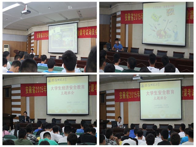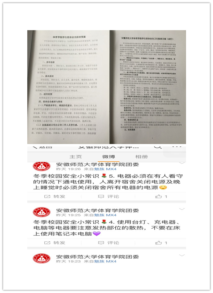 同时,学院通过多种渠道开展综合安全宣传工作。开学初,学院结合新生入学教育、党员培训,举行安全教育专题报告,组织新生校纪校规模拟考试、心理测评,增强新生安全防范意识。各班级召开安全知识主题班会,让学生安全教育真正入脑入心,将安全教育与主题活动相结合,制作教室板报,构建良好学习环境的同时,普及交通安全、寝室安全、心理健康、传染病防控等安全知识。充分发挥新媒体力量,在学院微博微信公共账号推送校园安全小贴士,确保校园安全信息全覆盖。