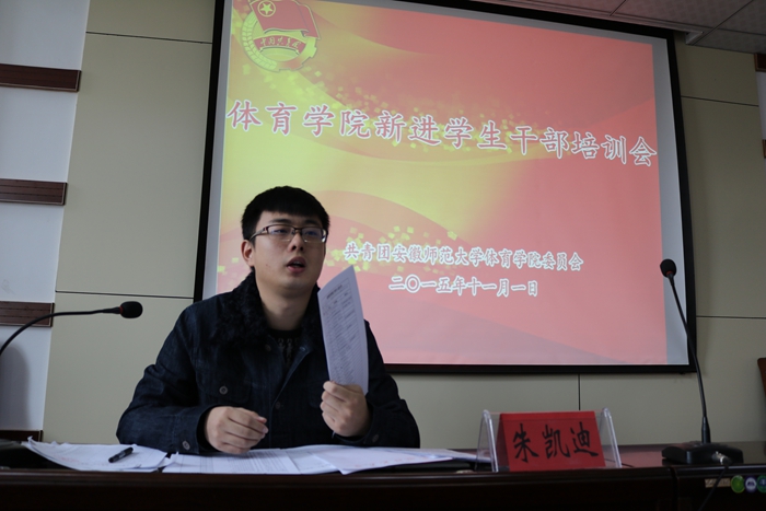 培训会上,朱凯迪首先介绍了团委书记的职责和团学组织学生干部的职责,他从“常规工作、重点工作、特色工作”三点介绍了团、学组织的工作情况,希望同学们发扬体院特色,鼓励同学们运用新媒体加强宣传,促进团学工作全面发展。最后,朱凯迪用“责任与使命、能力与品德、执行与思考”等问题明确团、学干部身上的责任和义务,勉励同学们要慎言慎行,从严要求自己,更好地实现自我超越。