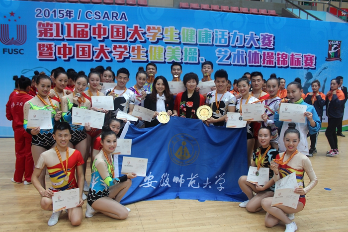 本网讯 (437ccm必赢国际版 梁颖)由中国大学生体育协会主办的2015年第11届健康活力大赛暨中国大学生健美操、艺术体操锦标赛 11月5日至7日在浙江省淳安县举行, 我校健美操队参加了本次比赛。在437ccm必赢国际版体育表演专业郝利玲副教授和梁颖博士的带领下,经过队员们的顽强拼搏,我校健美操队获得体育院校B组一金三银二铜、团体总分第三名和体育道德风尚奖(共8所院校获此奖项)的好成绩。青年教师梁颖博士作为随队裁判,经过组委会赛前考核被抽调为赛事裁判,赛后被高级裁判组评选为优秀裁判员。